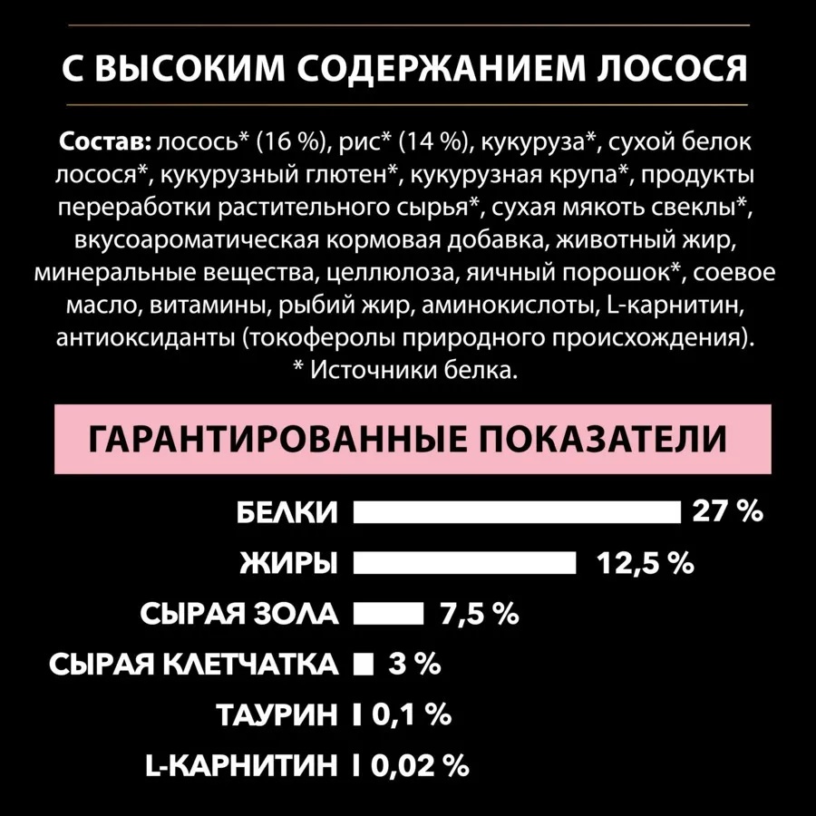 Лосось (16%), рис (14%), сухой белок лосося, кукуруза, кукурузный глютен, кукурузная мука, продукты переработки растительного сырья, животный жир, вкусоароматическая кормовая добавка, сухая мякоть свеклы, минеральные вещества, яичный порошок, целлюлоза, сушеный корень цикория, соевое масло, рыбий жир, витамины, L - карнитин, антиоксиданты.